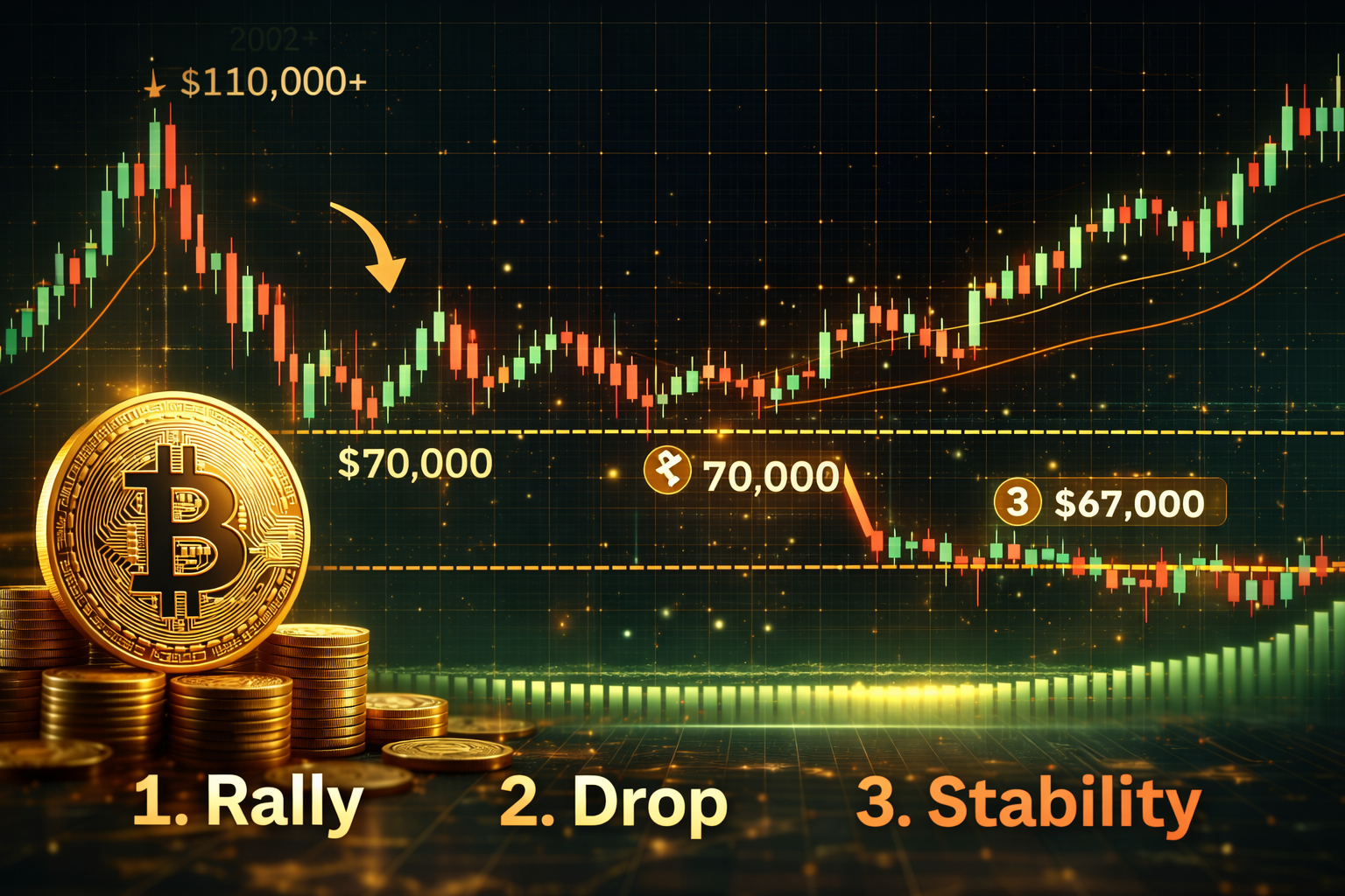 Bitcoin has moved through three phases since October 2025. First, late 2025 brought heavy excitement and strong buying, pushing prices above $110,000 and beyond what the market could hold. Second, early 2026 brought a sharp correction as buyers stepped back and price fell quickly into the low $60,000s. Third, Bitcoin stabilized near $70,000 and kept returning to the same zone, which often signals a rough balance between buyers and sellers.